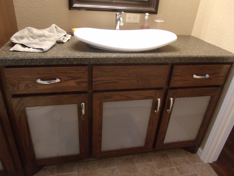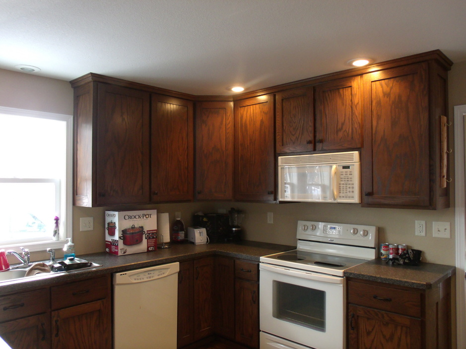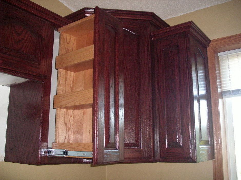 oak cabinets with raised panel doors upper slide out stained with rosewood stain.