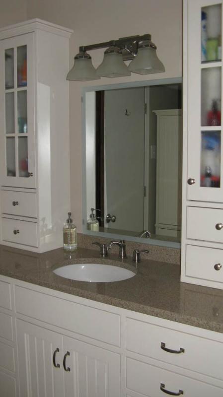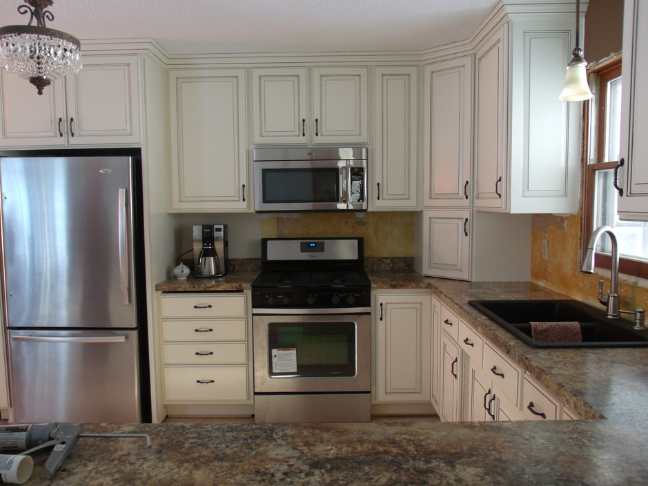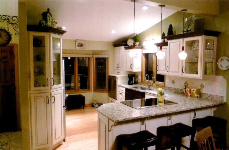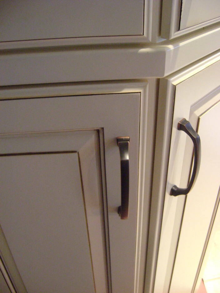 white painted maple cabinets with etching. granite countertops. the uppers are staggerd heights and depths bumped out sink and cooktop