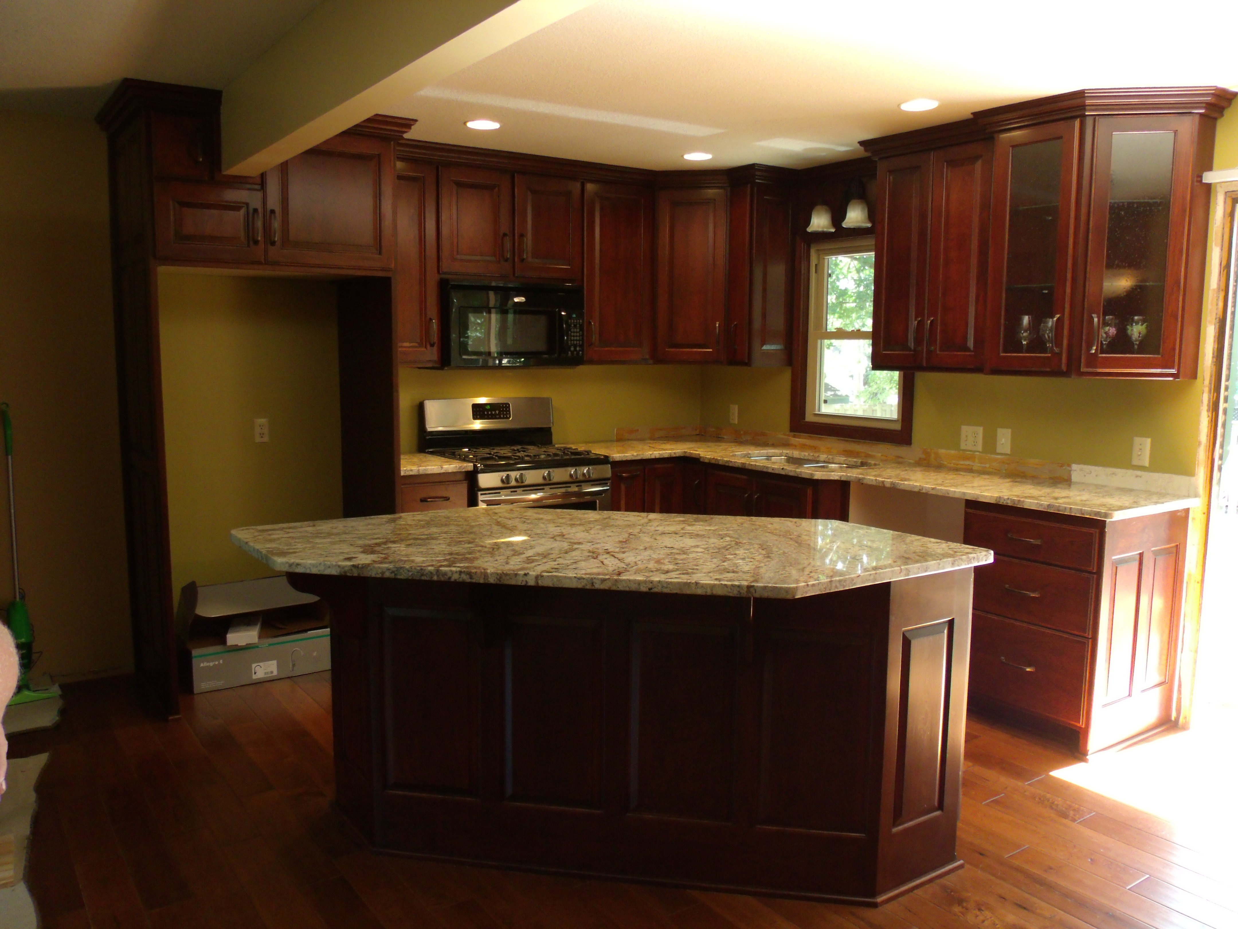 cherry cabinets with raised panel doors stained with rosewood color stain, granite counter tops