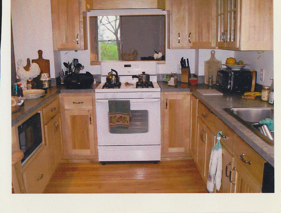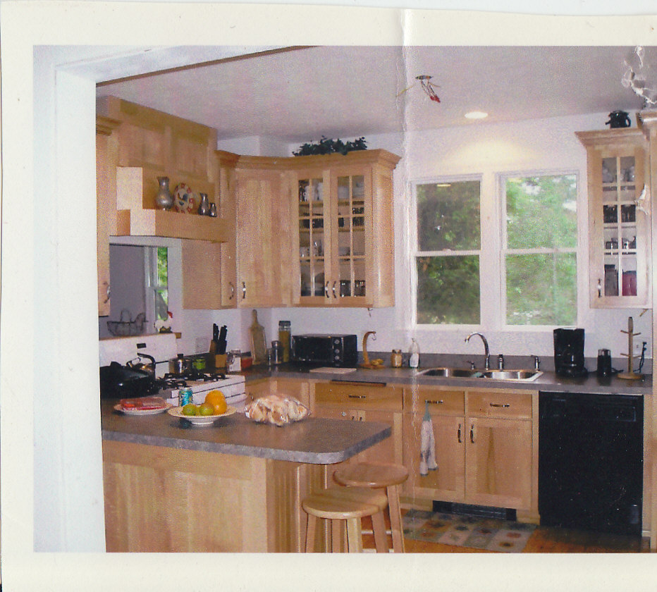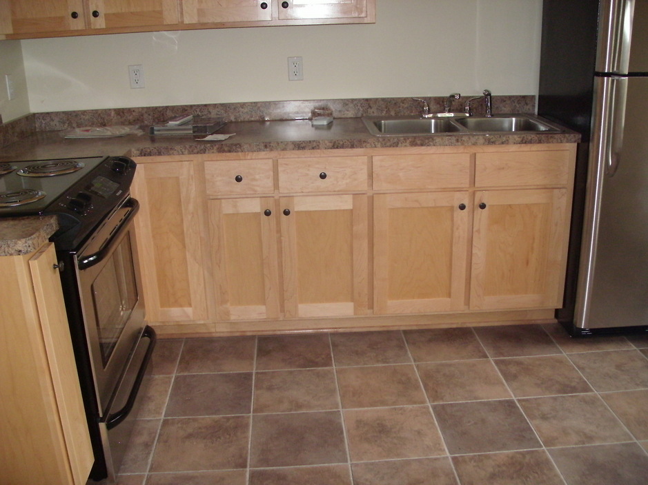maple cabinets, flat panel doors, clear coat, glass doors on the uppers